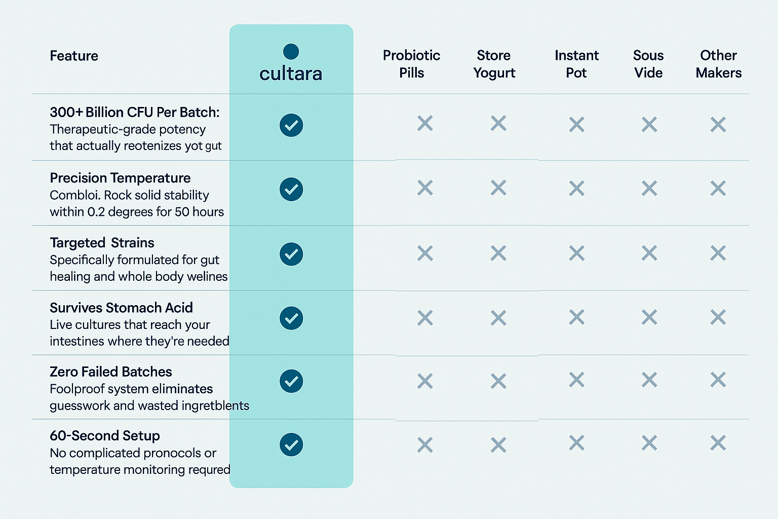 The difference? Store probiotics cost $30-60/month and maybe don't work. Our yogurt costs pennies per serving and delivers 6-30x more live cultures directly to your gut.