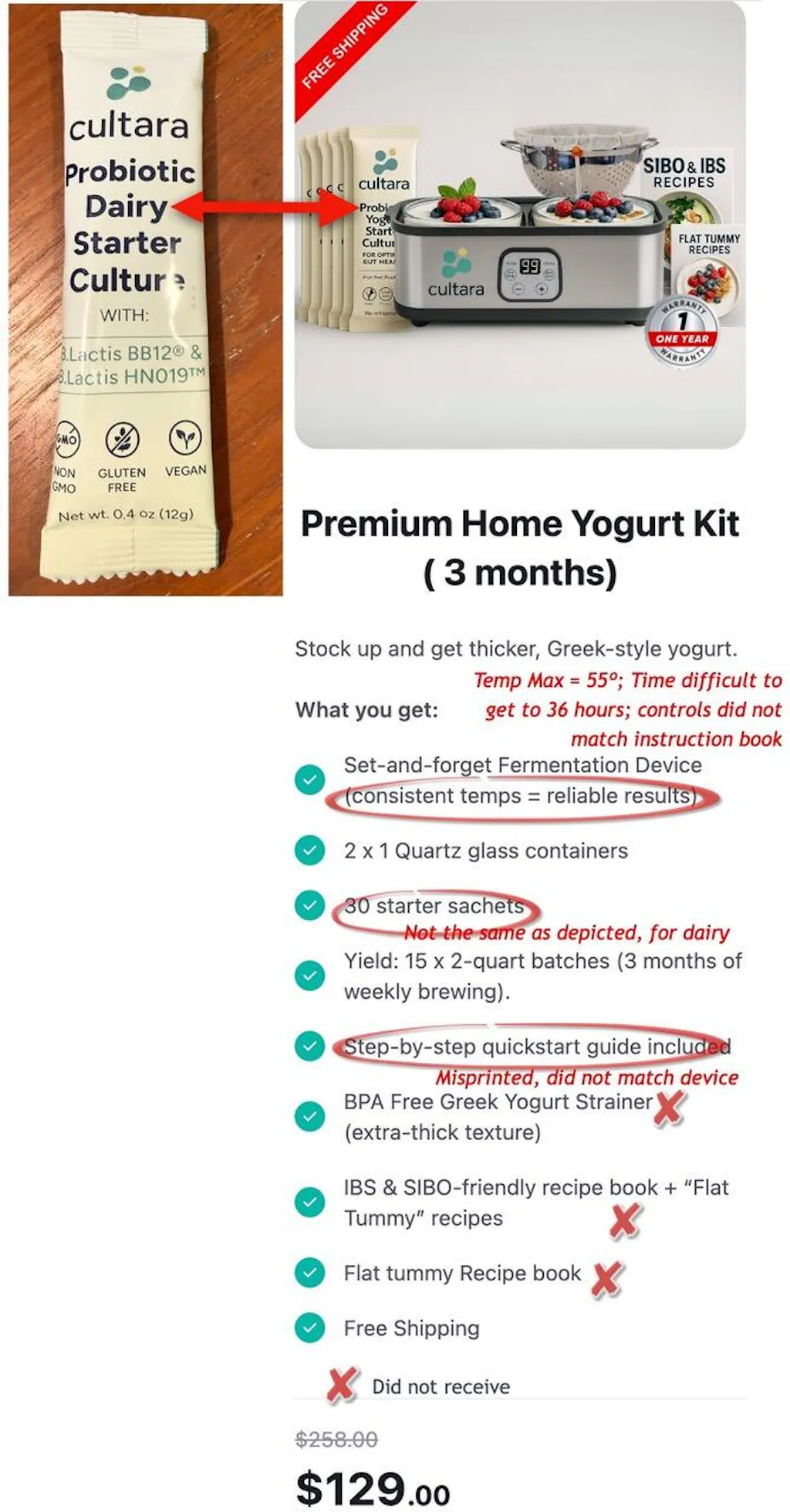 Everything about this order was a disaster. I got a notice in November saying it was on its way, only to be notified sometime later that it was backordered. I should have taken that opportunity to cancel. I did not receive the unit until February. The probiotics included were not non-dairy as specified in the advertising. The unit instructions did not match the equipment. Temperature setting in Celsius, instructions in ºF, etc. The greek yogurt strainer & recipe books listed in the ad for the "Pro Kit" were not included. A customer service person promised 3 times to ship the missing items but never has. While waiting I got a nearly identical unit (but with proper instructions) from another company that was half the price. I tried to be patient because they said they would send the other items, but I have given up. Sorry they couldn't get their act together, but I got ripped off.